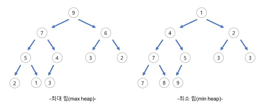 - 부모 노드의 키 값이 자식 노드의 키 값보다 항상 큰(작은) 이진 트리